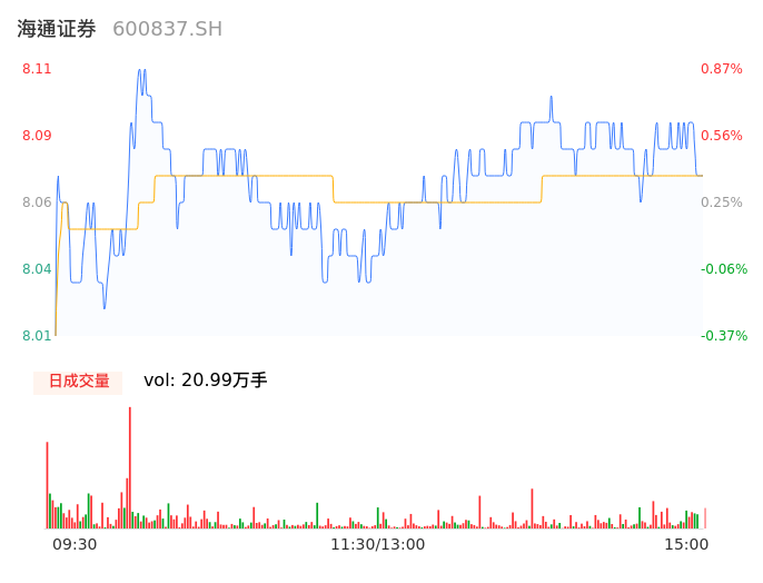 04月22日,海通证券收报8.09,股价涨幅0.62%,成交金额1.69亿元,换手率0.24%。