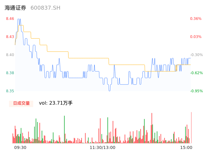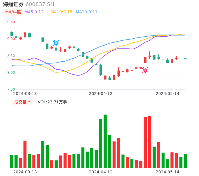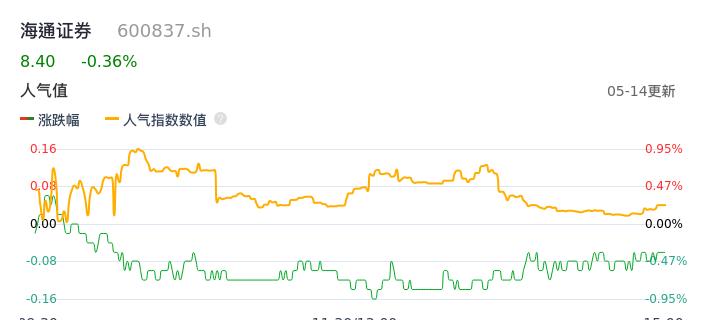 05月14日,海通证券收报8.40,股价涨幅-0.36%,成交金额1.99亿元,换手率0.27%。