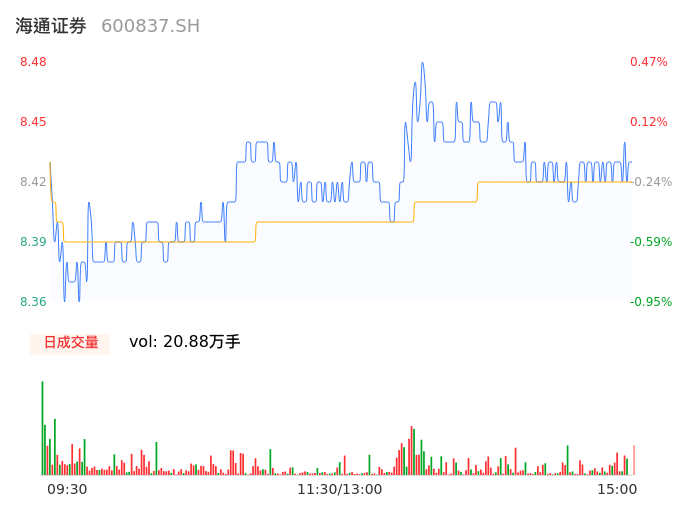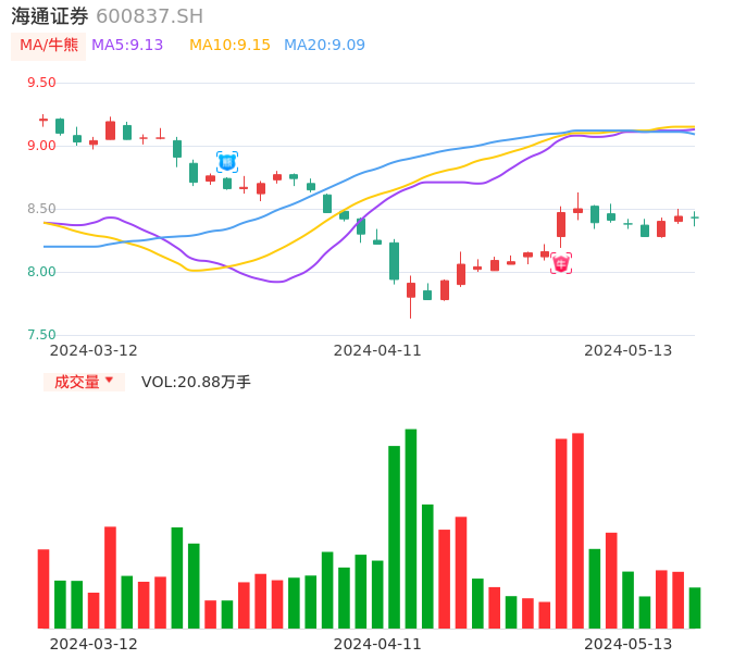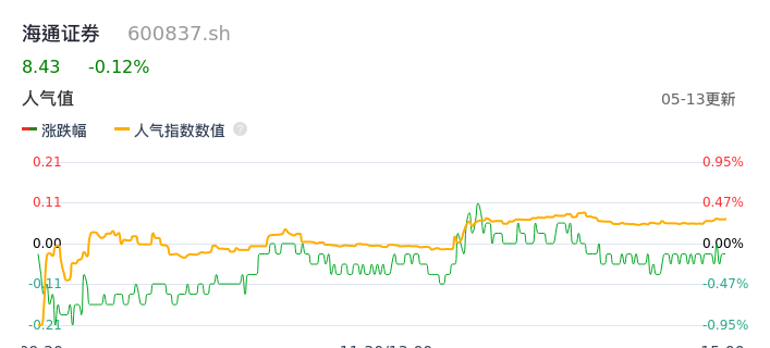 05月13日,海通证券收报8.43,股价涨幅-0.12%,成交金额1.76亿元,换手率0.24%。