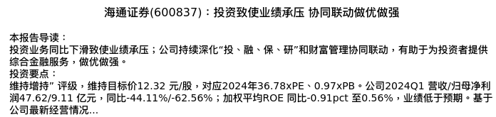 值得注意的是:2024年04月国泰君安的刘欣琦/王思玥分析师,首次发布关于海通证券的研究报告,标题为:海通证券(600837):投资致使业绩承压 协同联动做优做强。