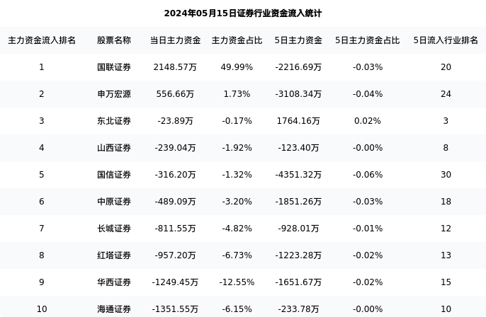 海通证券今日净流出1351.55万元,主力占比6.15%,在行业内排名:10/50;5日净流出233.78万元,主力占比0.00%,在行业内排名:10/50。