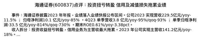 值得注意的是:2024年03月上海申银万国证券研究所的罗钻辉/金黎丹分析师,首次发布关于海通证券的研究报告,标题为:海通证券(600837)点评:投资扭亏转盈 信用及减值损失拖累业绩。