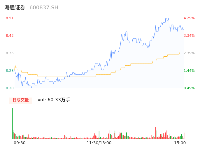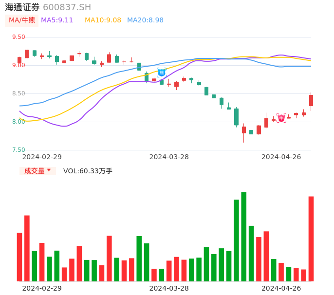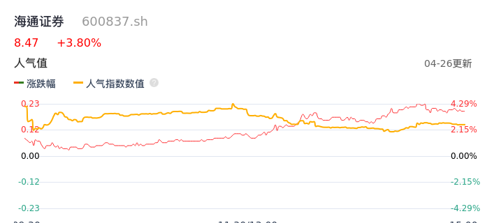 04月26日,海通证券收报8.47,股价涨幅3.80%,成交金额5.04亿元,换手率0.68%。