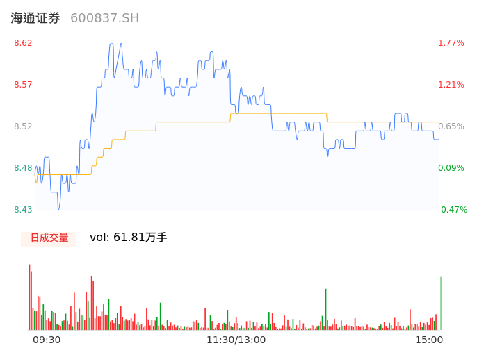 04月29日,海通证券收报8.50,股价涨幅0.35%,成交金额5.27亿元,换手率0.70%。