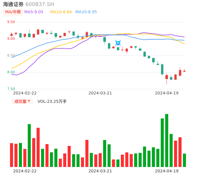 04月19日,海通证券收报8.04,股价涨幅-0.25%,成交金额1.87亿元,换手率0.26%。