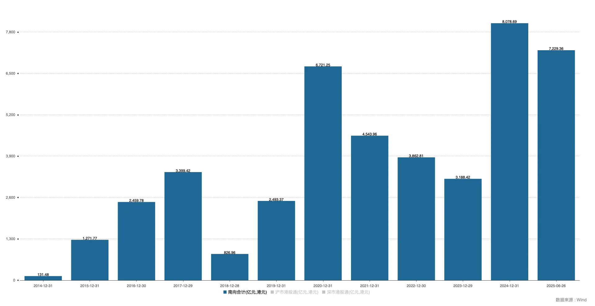 据Wind数据显示,南下资金年内已累计净买入逾7200亿港元,为历史同期最高。
