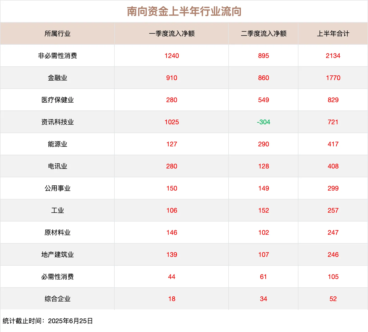 有意思的是,数据显示,上半年南向资金净流入前三的行业为非必需性消费、金融及医疗医疗保健行业,分别获得资金流入约2134亿、1770亿及829亿港元。恰恰对应了年内新消费、创新药及银行股的火热行情。