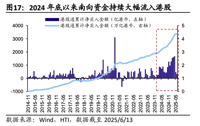 数据显示,今年以来,南向资金的港股持股占比从2024年初的14%升至2025年6月的21%。而截至2025年6月,港股通成交规模/港交所成交额的比例约28%。