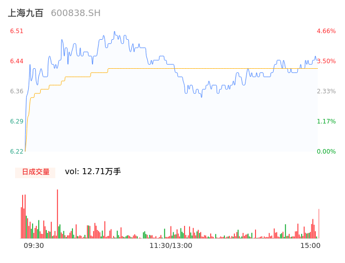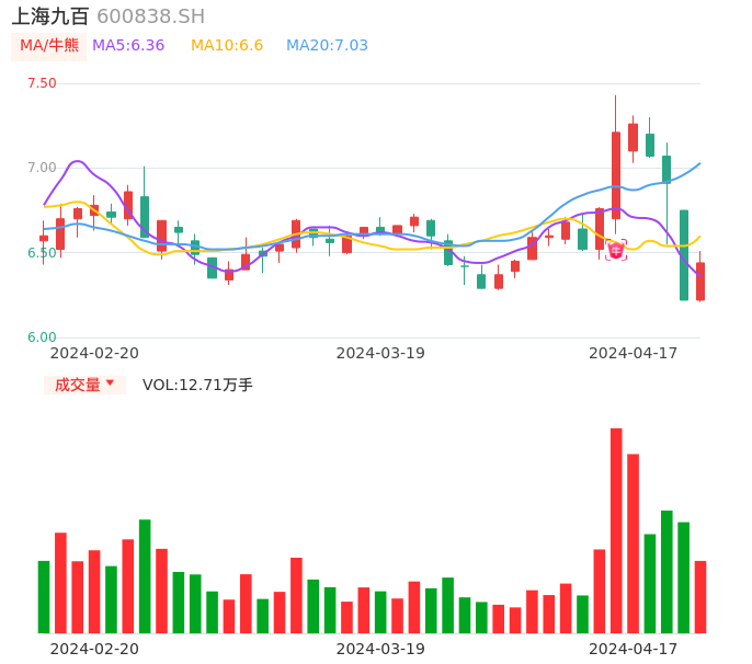 04月17日,上海九百收报6.44,股价涨幅3.54%,成交金额8154.64万元,换手率3.17%。