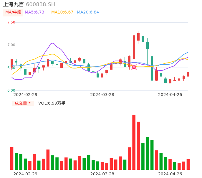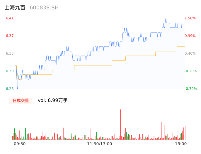 04月26日,上海九百收报6.40,股价涨幅1.43%,成交金额4440.43万元,换手率1.74%。