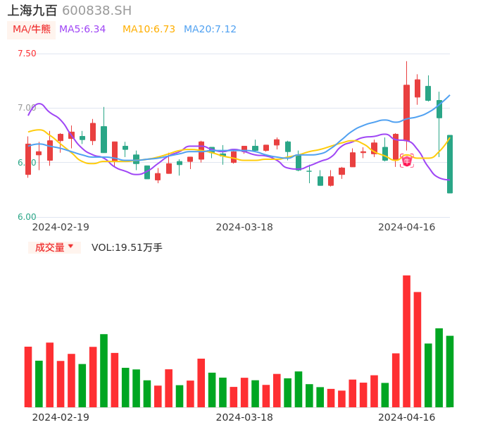 04月16日,上海九百收报6.22,股价涨幅-9.99%,成交金额1.24亿元,换手率4.87%。