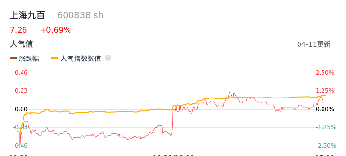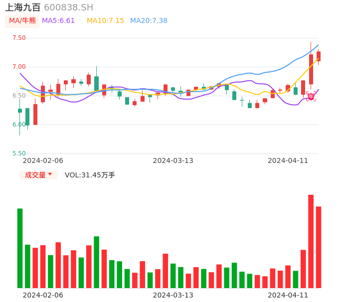 04月11日,上海九百收报7.26,股价涨幅0.69%,成交金额2.26亿元,换手率7.85%。