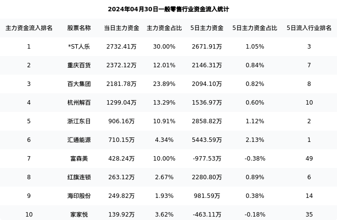 从主力资金流向来看,一般零售行业今日主力资金流入11.59亿元,在所有申万二级行业中排名:71/131。