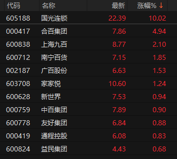 上证报中国证券网讯 10月22日午后,零售板块震荡回升,截至14时25分,国光连锁涨停,合百集团涨近5%,上海九百、南宁百货、广百股份等跟涨。