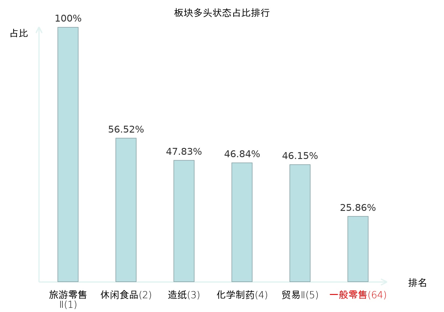 全市场所有行业板块中主力多头状态占比排名中,旅游零售Ⅱ板块位居第一。动物保健Ⅱ板块名次提升最快,较昨日上升58位。