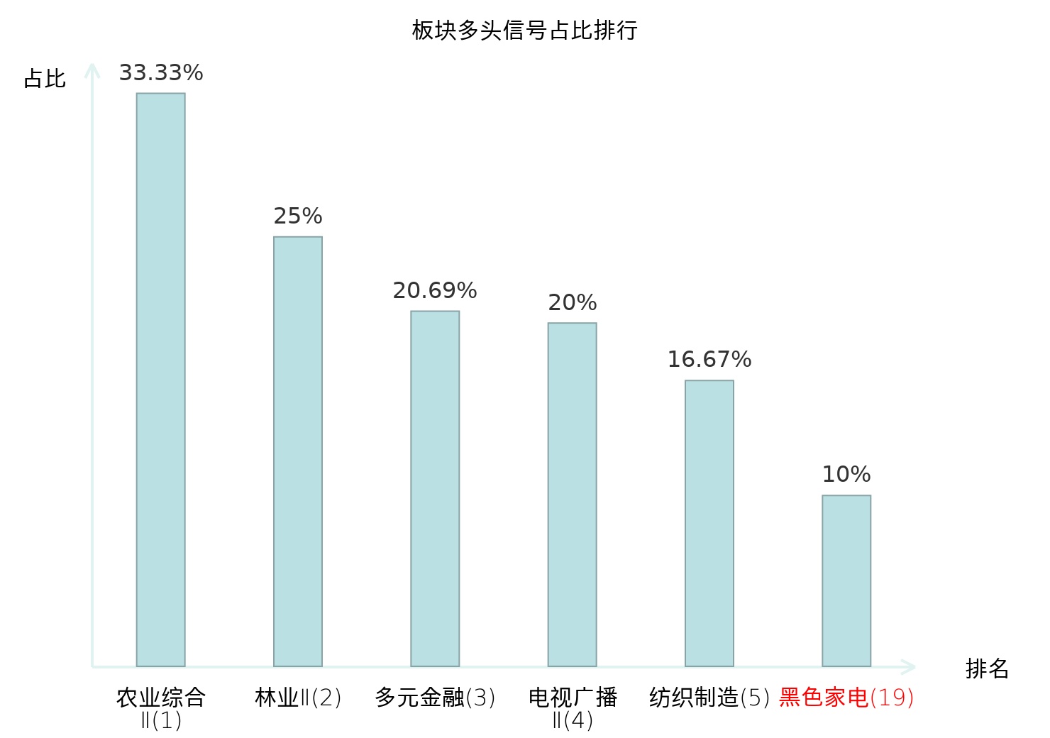 全市场所有行业板块中主力多头信号占比排名中,农业综合Ⅱ板块位居第一。农业综合Ⅱ板块名次提升最快,较昨日上升127位。
