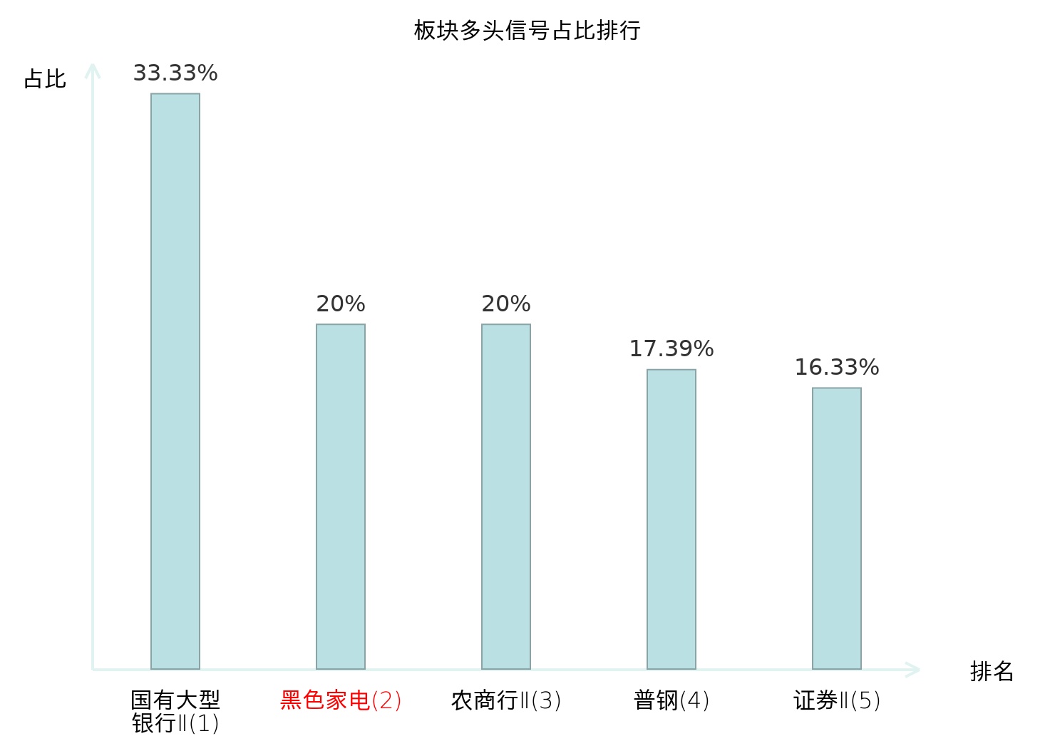 全市场所有行业板块中主力多头信号占比排名中,国有大型银行Ⅱ板块位居第一。国有大型银行Ⅱ板块名次提升最快,较昨日上升123位。