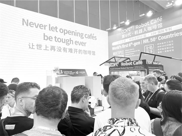 据介绍,韩兆林的公司在本次展会上推出的产品主要是一款机器人咖啡机,该机器人可通过机械臂递出咖啡,一次加料能制作300杯咖啡,还具备手工拉花等功能,其展台前聚集了大批境外采购商驻足。