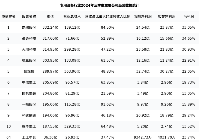 上工申贝最新报告期数据为三季度,下表汇总了专用设备行业内市值靠前的公司三季度主要经营数据