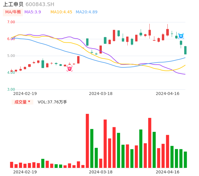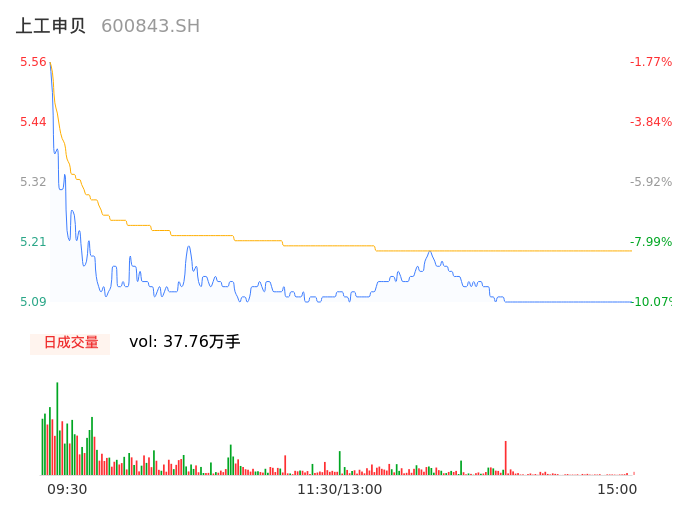 04月16日,上工申贝收报5.09,股价涨幅-10.07%,成交金额1.96亿元,换手率8.05%。
