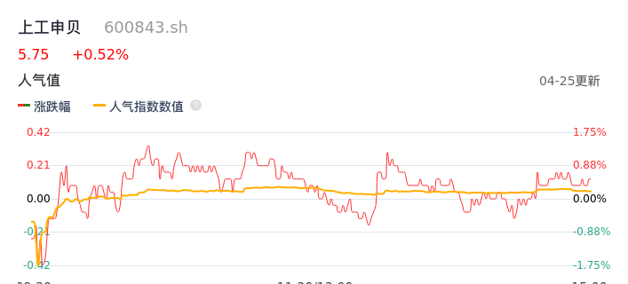 04月25日,上工申贝收报5.75,股价涨幅0.52%,成交金额1.47亿元,换手率5.47%。