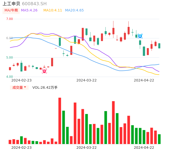 04月22日,上工申贝收报5.48,股价涨幅-5.68%,成交金额1.47亿元,换手率5.63%。