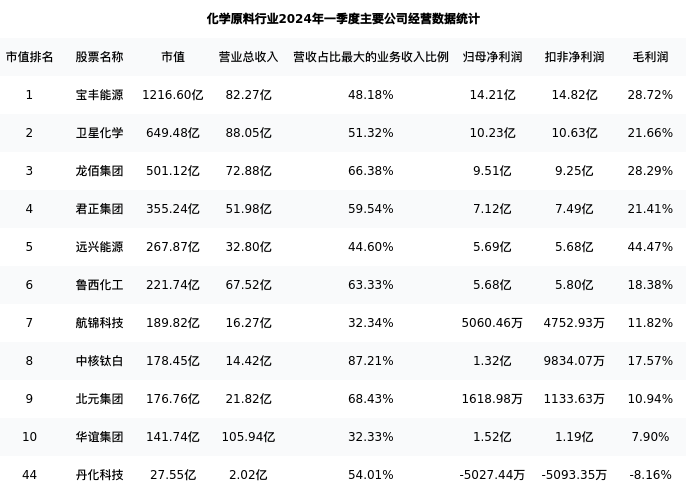 丹化科技最新报告期数据为一季度,下表汇总了化学原料行业内市值靠前的公司一季度主要经营数据
