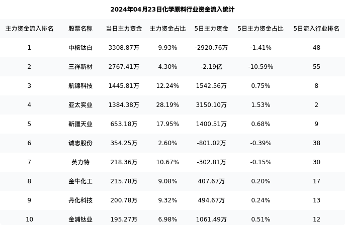 从主力资金流向来看,化学原料行业今日主力资金流入15.21亿元,在所有申万二级行业中排名:51/131。
