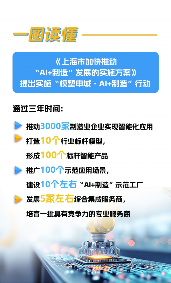8月19日,上海发布《上海市加快推动“AI+制造”发展的实施方案》(简称《实施方案》),明确实施“模塑申城·AI+制造”行动。上海计划通过三年时间努力,让上海制造业智能化发展水平进一步提升,在语料、模型、平台、场景等领域形成一批创新成果,包括推动3000家制造业企业实现智能化应用;打造10个行业标杆模型,形成100个标杆智能产品;推广100个示范应用场景,建设10个左右“AI+制造”示范工厂;发展5家左右综合集成服务商,培育一批具有竞争力的专业服务商,加快形成制造业智能化发展生态。