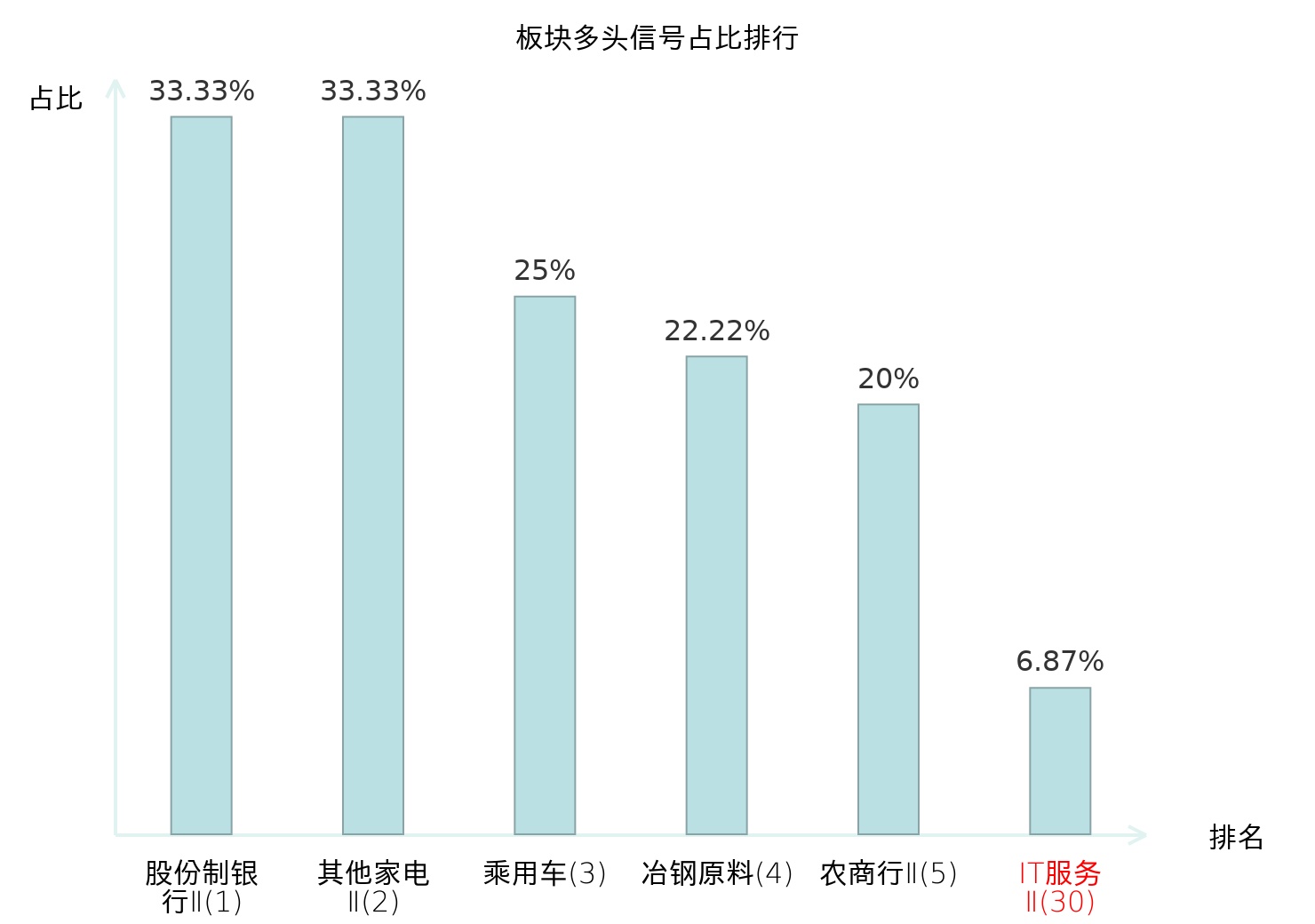 全市场所有行业板块中主力多头信号占比排名中,股份制银行Ⅱ板块位居第一。股份制银行Ⅱ板块名次提升最快,较昨日上升118位。