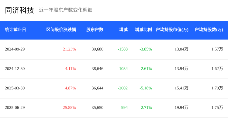 同济科技(600846)截至2025年6月30日的股东户数为3.57万,相较于上期减少2.71%。户均持股数量为2.79万股,户均持股市值为19.94万元,较上期分别增长2.79%和29.39%。这表明尽管股东户数减少,但留存的股东持有更多的股份,户均持股市值显著增加,反映出市场对公司价值的认可度提高。