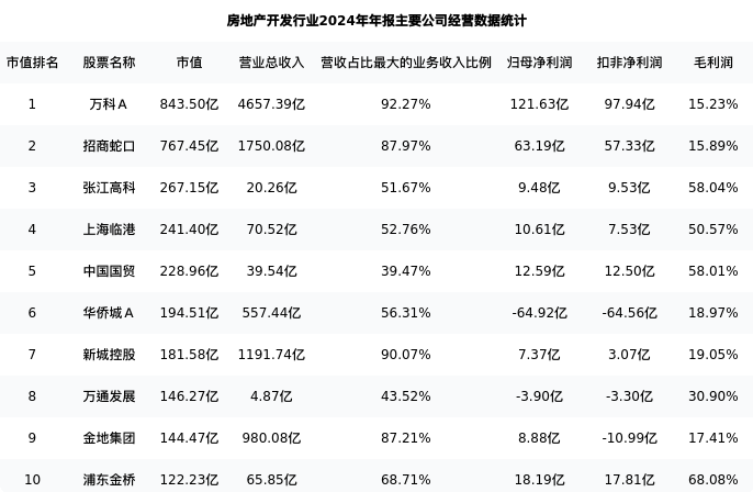 上海临港最新报告期数据为年报,下表汇总了房地产开发行业内市值靠前的公司年报主要经营数据