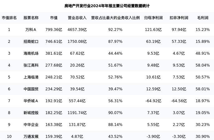 上海临港最新报告期数据为年报,下表汇总了房地产开发行业内市值靠前的公司年报主要经营数据