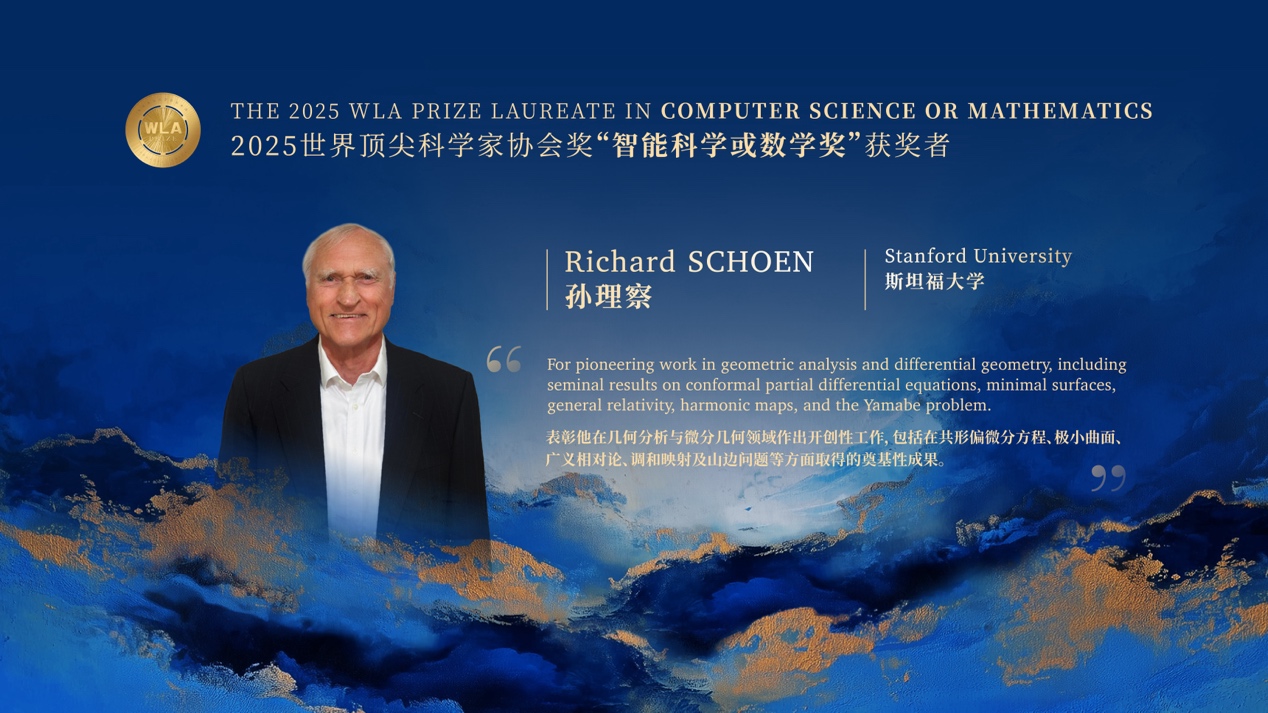 中国科学院院士、复旦大学上海数学中心主任李骏宣布2025顶科协奖“智能科学或数学奖”授予斯坦福大学人文与科学学院名誉讲席教授孙理察,表彰他在几何分析与微分几何领域作出开创性工作,包括在共形偏微分方程、极小曲面、广义相对论、调和映射及山边问题等方面取得的奠基性成果。孙理察将获得2025顶科协奖1000万元单项奖金。