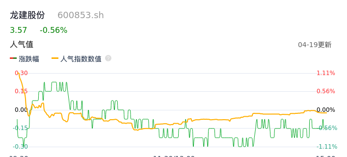 04月19日,龙建股份收报3.57,股价涨幅-0.56%,成交金额2982.51万元,换手率0.83%。