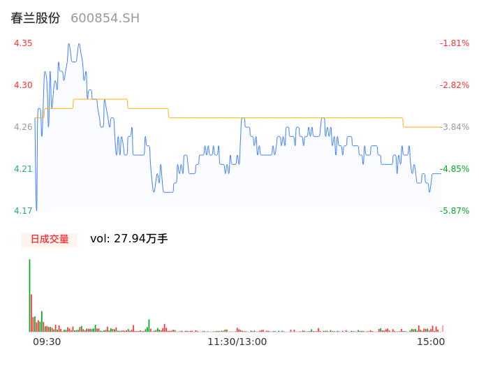 04月23日,春兰股份收报4.21,股价涨幅-4.97%,成交金额1.19亿元,换手率5.38%。