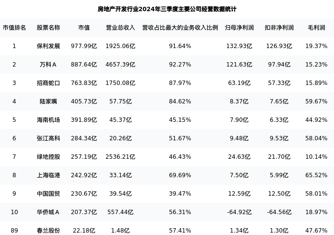 春兰股份最新报告期数据为三季度,下表汇总了房地产开发行业内市值靠前的公司三季度主要经营数据