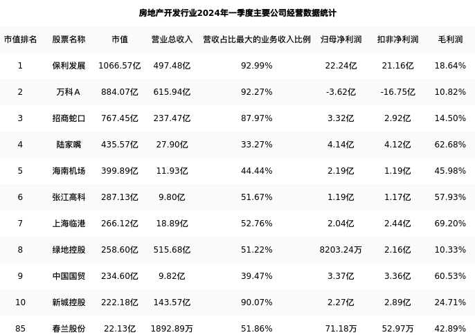 春兰股份最新报告期数据为一季度,下表汇总了房地产开发行业内市值靠前的公司一季度主要经营数据