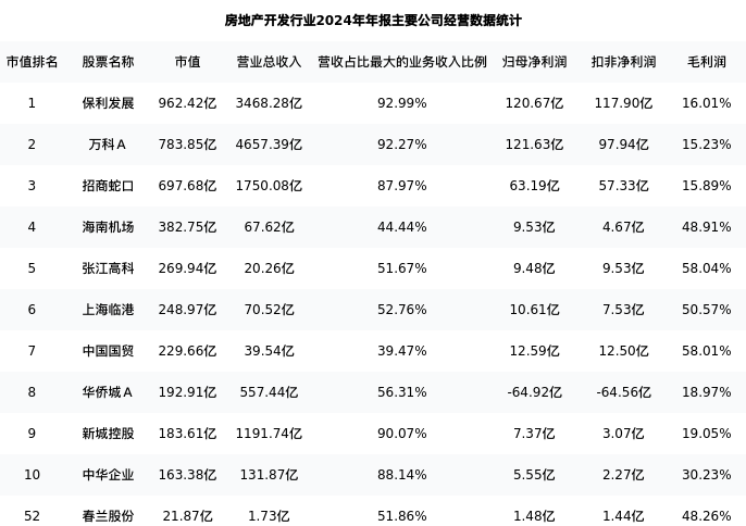 春兰股份最新报告期数据为年报,下表汇总了房地产开发行业内市值靠前的公司年报主要经营数据