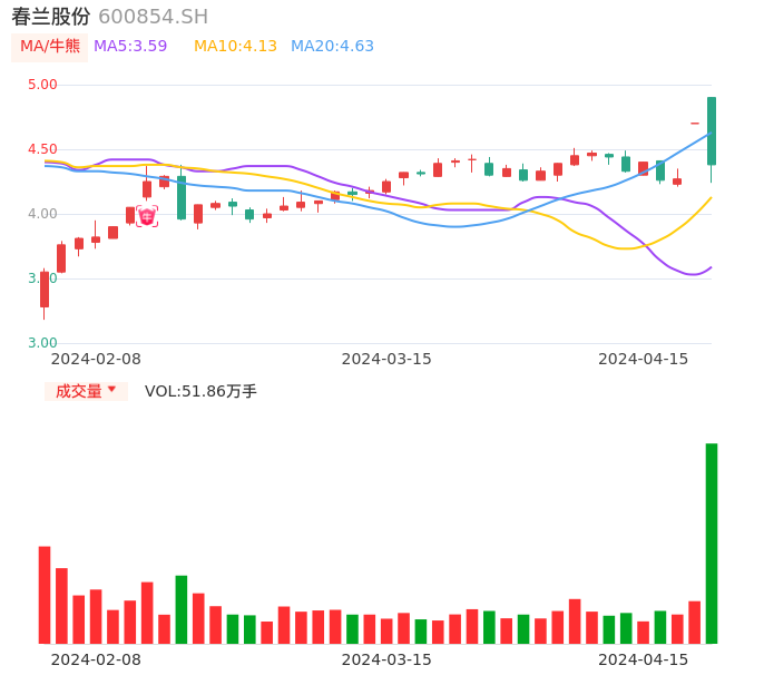 04月15日,春兰股份收报4.38,股价涨幅-6.81%,成交金额2.37亿元,换手率9.98%。