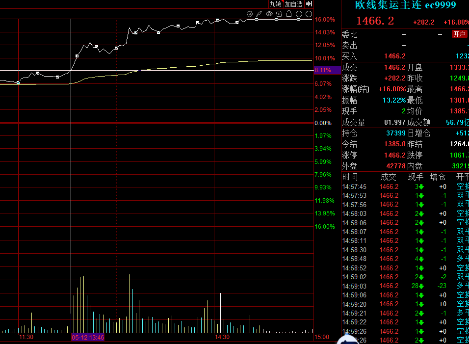主要是中美和谈超预期的消息提前走漏了风声。欧线集运早上高开8个点给市场奠定了主基调。下午1:46分主力开始发动进攻,拉到涨停。