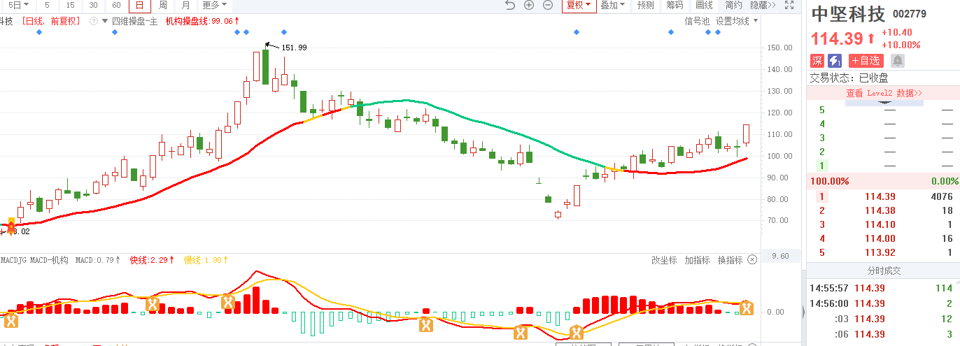1)中坚科技-四维操盘-近期出现火箭信号且底部量柱由绿转红