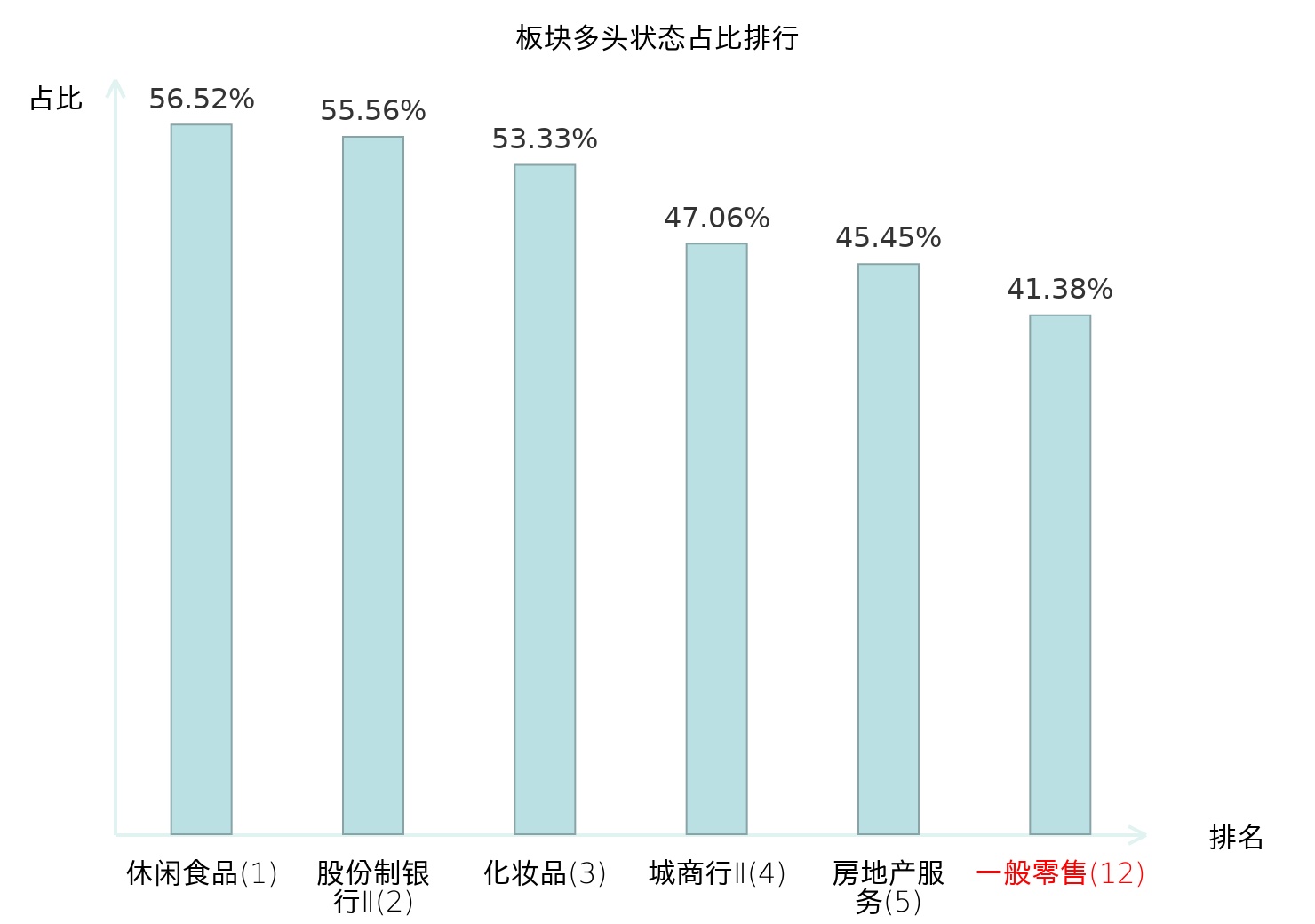 全市场所有行业板块中主力多头状态占比排名中,休闲食品板块位居第一。汽车服务板块名次提升最快,较昨日上升90位。