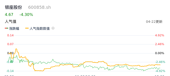 04月22日,银座股份收报4.67,股价涨幅-4.30%,成交金额1.13亿元,换手率4.60%。