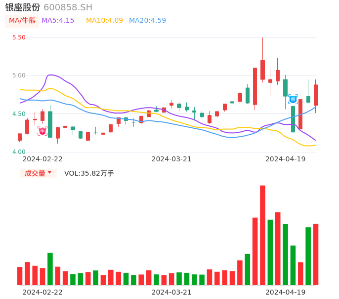 04月19日,银座股份收报4.88,股价涨幅4.95%,成交金额1.72亿元,换手率6.92%。