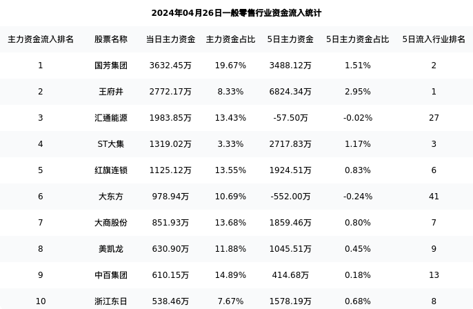 从主力资金流向来看,一般零售行业今日主力资金流入12.19亿元,在所有申万二级行业中排名:48/131。