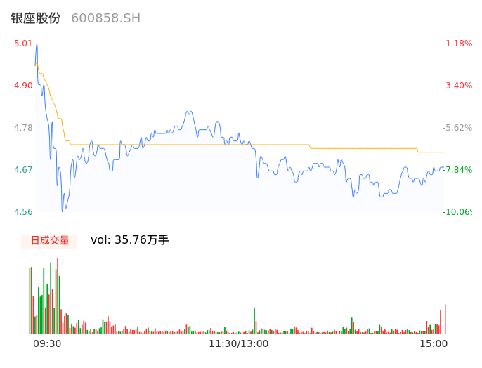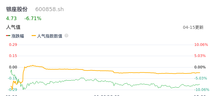 04月15日,银座股份收报4.73,股价涨幅-6.71%,成交金额1.69亿元,换手率6.91%。