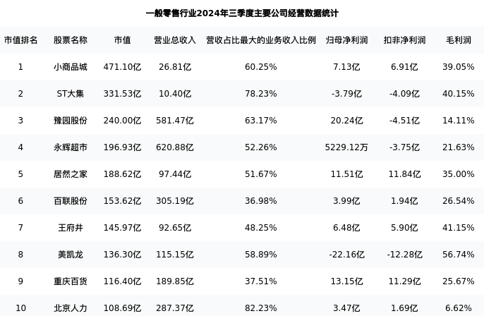 王府井最新报告期数据为三季度,下表汇总了一般零售行业内市值靠前的公司三季度主要经营数据