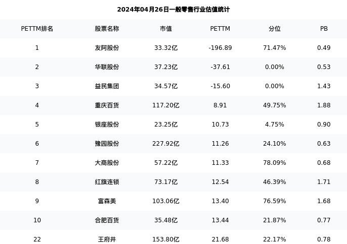 从估值角度看:王府井最新市盈率PETTM为21.68,在行业内排名19/62,处于22.17分位。