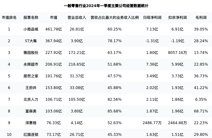 王府井最新报告期数据为一季度,下表汇总了一般零售行业内市值靠前的公司一季度主要经营数据
